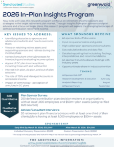 Greenwald Research’s In-Plan Insights Program focuses on opportunities in the larger retirement plan market, including in-plan retirement income solutions, accumulation investment options, and strategies. Through insights from plan sponsors and plan advisors, this study will explore the changing landscape of retirement planning and the role of the workplace.